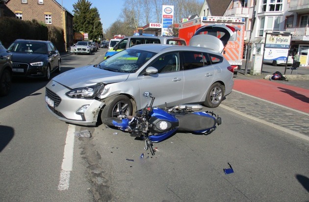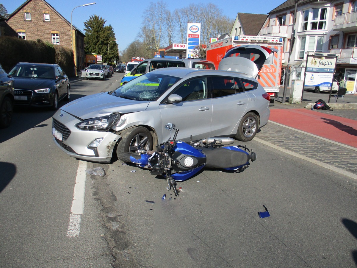 Nach ersten Erkenntnissen befand sich ein 83-jähriger Odenthaler auf dem Parkplatz eines Lebensmittegeschäftes. Gegen 14:40 Uhr beabsichtigte er, den Parkplatz mit seinem Pkw der Marke Ford zu verlassen und auf die Altenberger-Dom-Straße abzubiegen. An der Ausfahrt ließ er zunächst mehrere Verkehrsteilnehmer durch, die in Fahrtrichtung Burscheid unterwegs waren. Als er daraufhin zu seinem Abbiegevorgang in Fahrtrichtung Odenthal ansetzte, übersah er den 48-Jährigen auf seinem Kleinkraftrad und es kam zur Kollision.