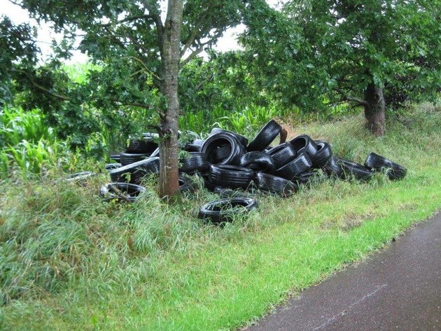 In den vergangenen Tagen in der Zeit vom Mi, 29.7.15, bis Do, 30.7.15, entsorgte man im Bereich Prinzenhof in Freienwill in einer Sackgasse etwa 40 Altreifen. Beamte der Polizeistation Husby leiteten ein Ermittlungsverfahren wegen Verstoßes gegen umweltrechtliche Bestimmungen ein. Der Fundort befindet sich unweit eines Abfallwirtschaftshofes in Flensburg, wo die Reifen ordnungsgemäß hätten entsorgt werden können. Verantwortlicher, Zeugen und Hinweisgeber melden sich bitte unter 04634/939798-0 bei der Polizei in Husby.