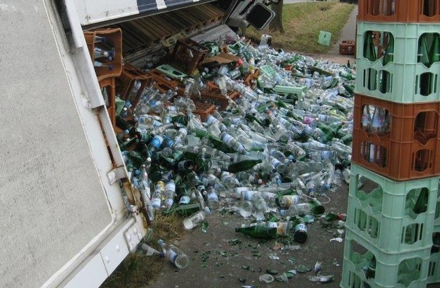 Verletzt wurde bei dem Unfall glücklicherweise niemand. Die Straßenmeisterei richtete eine Vollsperrung ein, die bis etwa 16.40 Uhr andauerte. Der Geh- und Radweg wurde von der eingesetzten Feuerwehr von den Flaschen befreit. Der verunfallte LKW wurde mittels eines Krans geborgen, die aufgerissene Bankette mit Baken abgesichert.