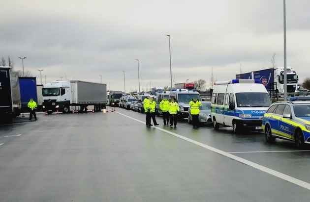 Donnerstagmorgen (01.02.2018) wurde der Schwerlastverkehr auf der A7 durch spezialisierte Kräfte der Verkehrsüberwachung kontrolliert. Zwischen 09:00 und 12:00 Uhr wurden alle Lkw auf den Parkplatz "Jalmer Moor" geleitet und von Beamten des Polizeiautobahn- und Bezirksreviers Nord, Kollegen des Sondereinsatzzuges der PD AFB, des Zolls, der Bundespolizei und des Bundesamtes für Güterverkehr überprüft.