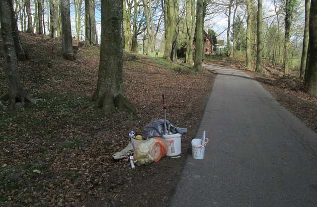 Am Montagnachmittag (23.04.18) wurde bei der Polizeistation in Tarp eine Anzeige wegen unerlaubter Abfallentsorgung aufgenommen. Im Waldweg in Oeversee wurden Malerutensilien abgeladen. Farbeimer mit Farbresten, Kleister etc. wurden dort am Wegesrand illegal entsorgt. Die Beamten gehen davon aus, dass der Müll mit einem Fahrzeug in den Wald gebracht wurde. Da dieser Weg bei Fußgängern und Reitern beliebt ist, hoffen die Ermittler auf Zeugen oder Hinweisgeber. Diese werden gebeten, sich unter der Rufnummer 04638-89410 zu melden.
