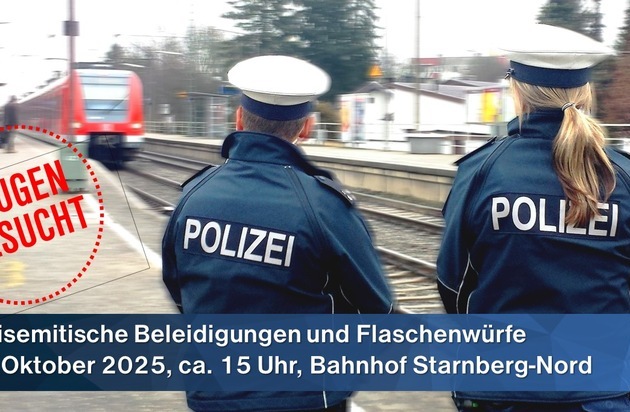 Am Freitag, den 10. Oktober 2025, gegen 15:00 Uhr, beleidigte ein bislang unbekannter Mann am Bahnsteig des Bahnhofs Starnberg Nord mehrere Reisende und äußerte dabei judenfeindliche Parolen. Zudem soll der Täter mehrere Glasflaschen auf den gegenüberliegenden Bahnsteig geworfen haben. Ob er dabei gezielt auf Personen zielte, ist derzeit unklar. Im Anschluss bestieg der Mann die S-Bahn der Linie S6 in Richtung Zorneding. Ob es während der weiteren Fahrt zu weiteren strafbaren Handlungen kam, ist Gegenstand der laufenden Ermittlungen.