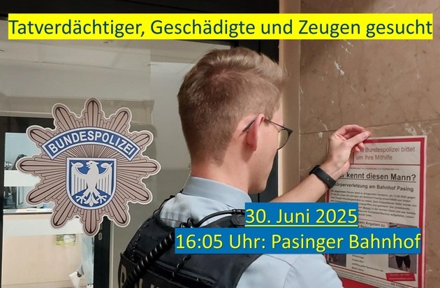 Im Auftrag der Staatsanwaltschaft München I sucht die Bundespolizei auf Beschluss des Amtsgerichtes München mit Lichtbildern nach dem Unbekannten. Diese können auf der Internetseite der Bundespolizei unter nachstehendem Link aufgerufen werden. https://bundespolizei.de/aktuelles/fahndungen/30-juni-2025-gefaehrliche-koerperverletzung-am-bahnhof-muenchen-pasing-01-2026