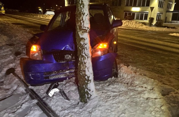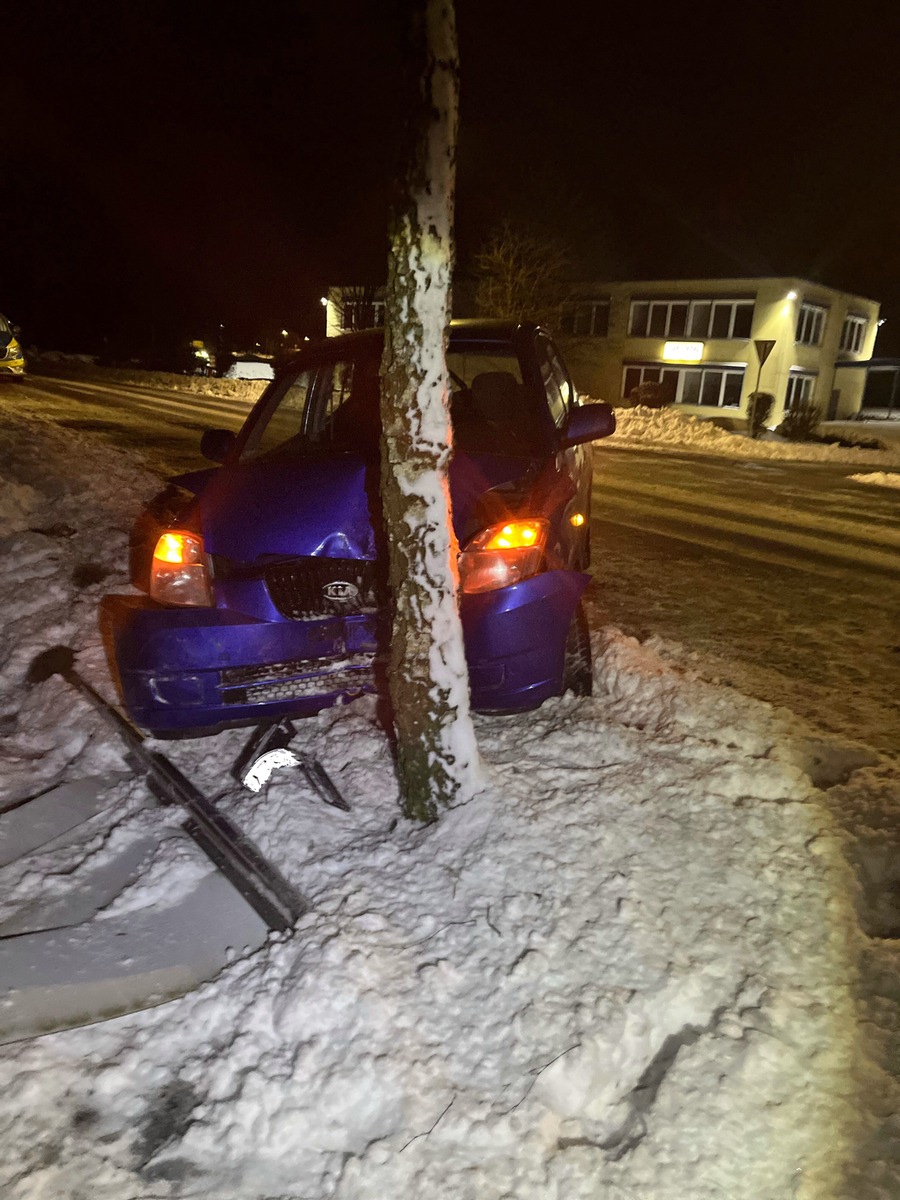 Ein 21-Jähriger aus Marienheide war am Sonntag (4. Dezember) mit seinem Kia auf der Müllenbacher Straße in Richtung Rodt unterwegs. Gegen 21:25 Uhr kam der 21-Jährige auf der winterglatten Fahrbahn nach rechts von der Straße ab, kollidierte zunächst mit einem Industrieschild und anschließend mit einem Baum. Der Marienheider sowie sein 21-jähriger Beifahrer wurden leicht verletzt und von Rettungskräften in ein Krankenhaus gebracht. Der Kia war nicht mehr fahrbereit und musste abgeschleppt werden. Der Verkehrsunfall ereignete sich auf Höhe der "Raiffeisenstraße".