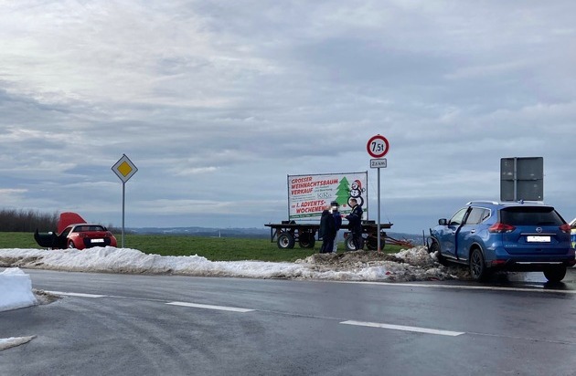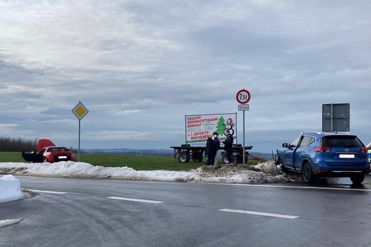Bei einem Autounfall im Kreuzungsbereich der K6 mit der L130 am Dienstag (13. Januar) haben sich drei Personen leichte Verletzungen zugezogen. Gegen 14:35 Uhr fuhr ein 25-Jähriger aus Wermelskirchen in einem Smart auf der K6 aus Önkfeld kommend in Richtung Sondern. Im Kreuzungsbereich mit der L130 kam es zur Kollision mit dem Nissan eines 63-Jährigen. Der 63-jährige Wipperfürther war auf der vorfahrtsberechtigten L130 in Richtung Keilbecker Straße unterwegs. Der 25-Jährige, seine 26-jährige Beifahrerin und der 63-Jährige zogen sich bei dem Unfall leichte Verletzungen zu. Sie kamen in umliegende Krankenhäuser. Bei der Unfallaufnahme stellten die Beamten fest, dass an dem Smart Kennzeichen angebracht waren, die als gestohlen gemeldet waren. Zudem war der Smart weder zugelassen noch versichert.