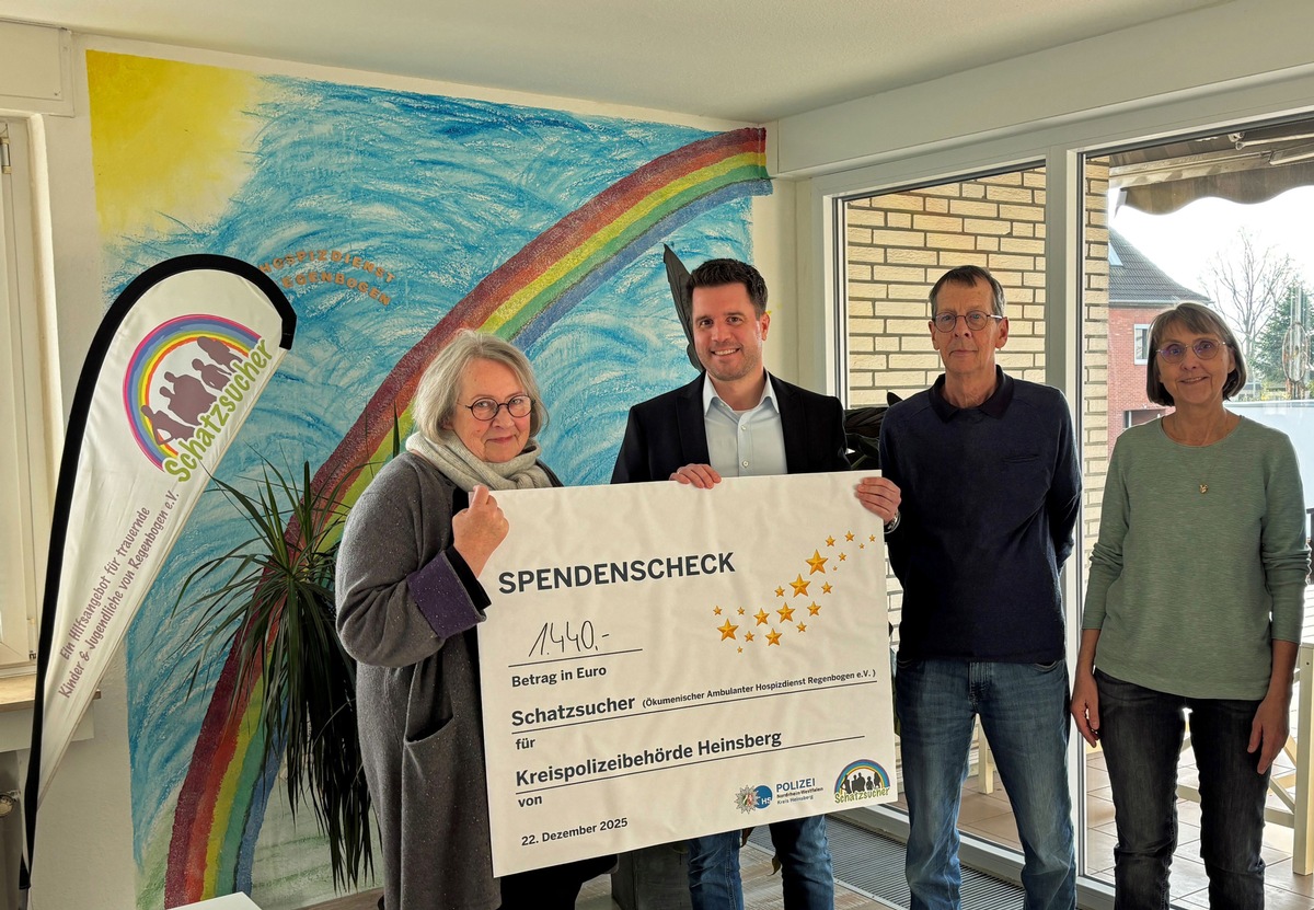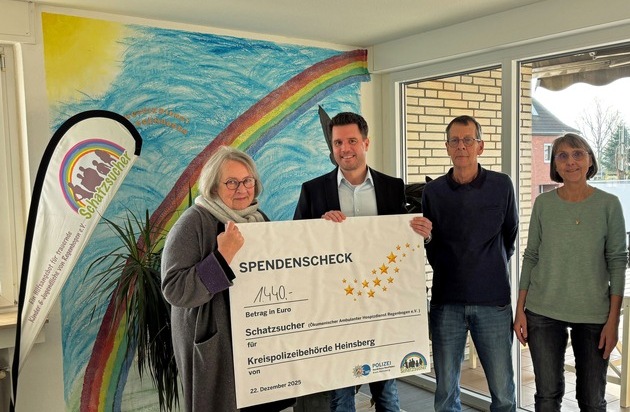 Der Erlös der Aktion wird vollständig an die "Schatzsucher" in Wassenberg gespendet, ein Projekt des Ambulanten Hospizdienstes Regenbogen e.V. Kriminalrat Stephan Rüller hat heute den Spendenscheck an Edith Jankowski, Paul Hardt und Gabriele Beyer übergeben: "Die Schatzsucher leisten wertvolle Arbeit, indem sie jungen Menschen in belastenden Lebenssituationen Halt, Orientierung und einen geschützten Raum für ihre Trauer bieten. Mit unserer Spende soll diese wichtige Arbeit unterstützt und den betroffenen Kindern und Jugendlichen langfristige Hilfe ermöglicht werden."