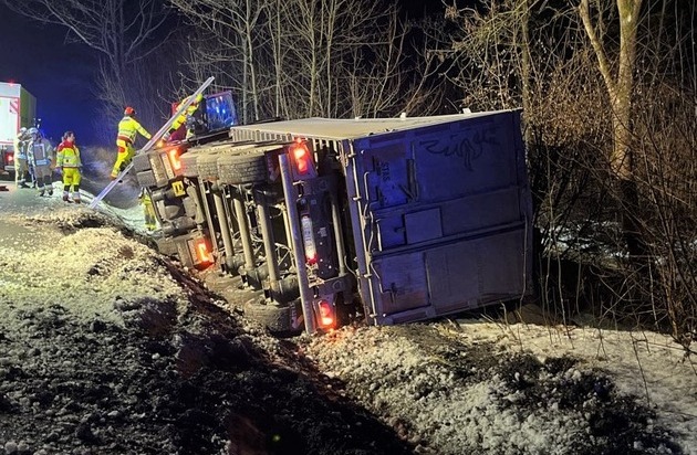 Am Freitag, 16. Januar, befuhr ein Lkw mit Auflieger die B68 aus Richtung Warburg-Scherfede kommend in Fahrtrichtung Paderborn. Gegen 4.30 Uhr kam das Gespann etwa in Höhe der Abfahrt Hardehausen aus noch ungeklärter Ursache nach rechts von der Fahrbahn ab. Der mit Getreide beladene Sattelauflieger kippt daraufhin auf die rechte Fahrzeugseite und blieb auf dem Grünstreifen liegen. Der 58-jährige Fahrer wurde durch die Feuerwehr aus seiner Fahrerkabine befreit und zur weiteren medizinischen Untersuchung in ein Krankenhaus gebracht.