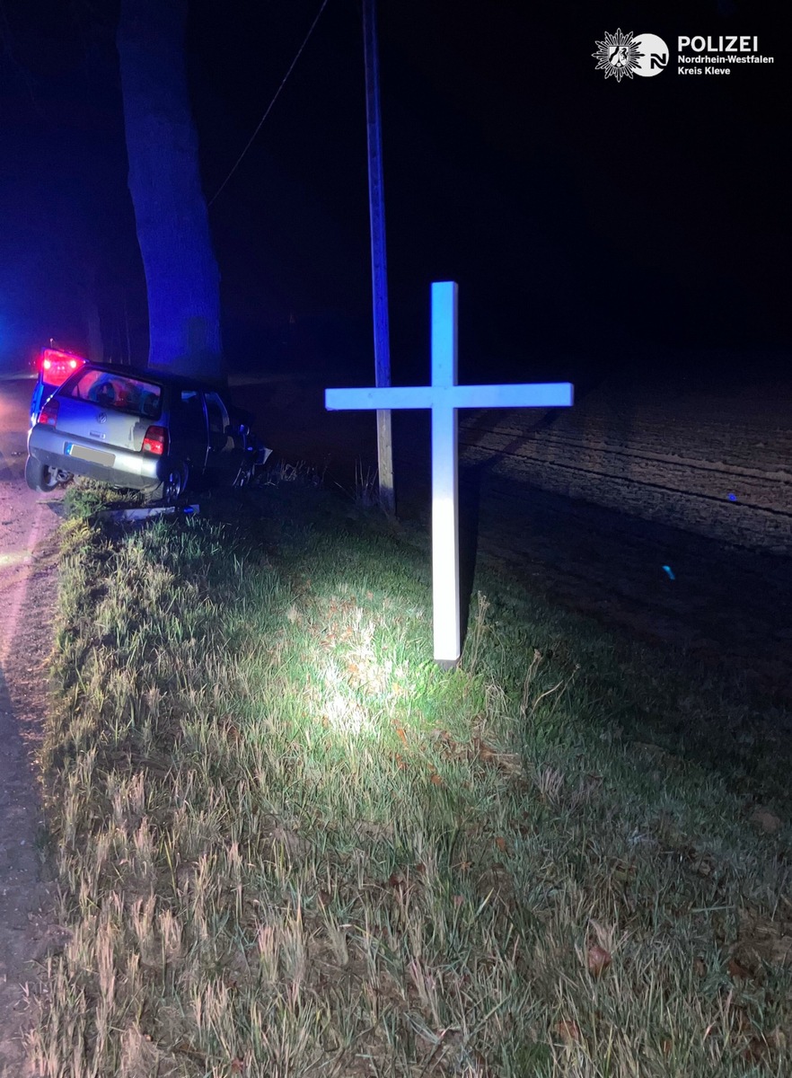 Am Sonntag (8. März 206) gegen 21:00 Uhr ereignete sich auf der Eltener Straße ein Verkehrsunfall, bei dem sich ein junger Mann schwere Verletzungen zuzog. Der 21-Jährige aus Emmerich war in seinem VW in Richtung Hüthum unterwegs, als er aus bislang unbekannter Ursache mit dem Wagen nach rechts von der Fahrbahn abkam. Der VW streifte zunächst ein sogenanntes "Weißes Kreuz", das an eine 69-jährige Autofahrerin erinnert, welche im März 2024 an dieser Örtlichkeit bei einem Verkehrsunfall ihr Leben verlor. Danach prallte der VW gegen einen Baum am Fahrbahnrand. Bei der Kollision trug der Mann schwere Verletzungen davon, der PKW erlitt einen Totalschaden.