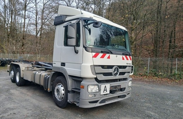 Im Tatzeitraum von Freitag, 28.11.2025, 17 Uhr, bis Montag, 01.12.2025, 09 Uhr, wurde vom Gelände eines Händlers für gebrauchte Nutzfahrzeuge an der Werdohler Landstraße ein Lkw vom Typ "Mercedes-Benz Actros 2544" in weiß entwendet (Foto). Der Lkw ist ein ehemaliges Fahrzeug eines örtlichen Entsorgungsbetriebs. Der so genannte "Abrollkipper" ist mit entsprechender Beklebung versehen und verfügt über eine Ladefläche zur Aufnahme von Abfall-Containern. Kennzeichen befanden sich nicht am Fahrzeug. Ob falsche oder ggf. entwendete Kennzeichen angebracht wurden, ist nicht bekannt.