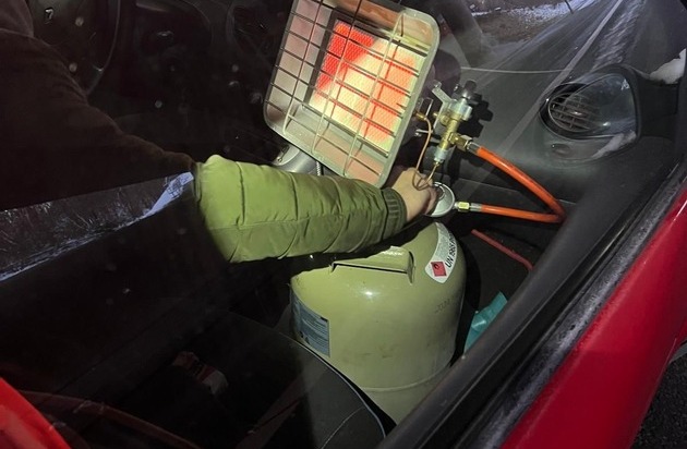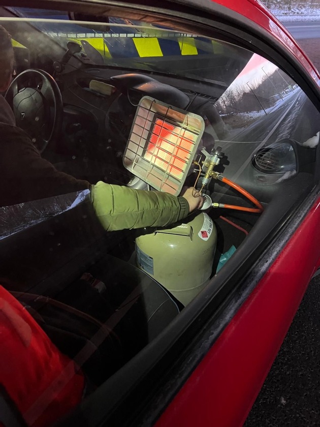 Mittwoch und Donnerstag hatte die Polizei in Iserlohn insbesondere in den frühen Morgenstunden bei eisigen Temperaturen den Verkehr auf den Straßen im Blick. Insbesondere in Industriegebieten und an Grundschulen kam das Lasergerät zur Überwachung der Geschwindigkeit zum Einsatz. Auch die Verkehrssicherheit von Fahrzeugen und die Verkehrstüchtigkeit der Fahrer standen im Fokus. 16 Fahrer waren Mittwoch zu zügig unterwegs. Der Spitzenreiter fuhr mit 75 km/h durch das Industriegebiet Sümmern und wurde angezeigt. Mehrere weitere Verstöße kamen zum Vorschein, darunter ein "Highlight", das im polizeilichen Jahresrückblick 2026 sicher Erwähnung finden wird. Ein Autofahrer betrieb während der Fahrt einen Heizstrahler samt Gasflasche im Fußraum des Beifahrers (Foto). Das brachte ihm zwar einen warmen Innenraum, aber auch eine Anzeige ein. Von einer Nachahmung des gefährlichen Unterfangens rät die Polizei dringend ab. Auch Donnerstag überschritten Autofahrer 31 Mal die zulässige Geschwindigkeit. Hinzu gesellten sich 17 weitere Verstöße, z.B. weil Autofahrer Ihr Fahrzeug nicht von Schnee und Eis befreit hatten. Erfreulich: an den Grundschulen "Lichte Kammer" und "Im Wiesengrund" hielten sich alle an die Tempolimits. Dafür gab es viele bereichernde Gespräche mit Eltern, die ihre Kids zur Schule brachten. Die Polizei kündigt vergleichbare Kontrollen auch für die Zukunft an. (lubo)