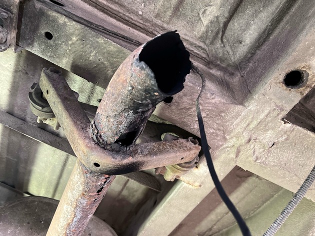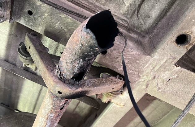 Insgesamt wurden bei dem Kfz 92 (!) teilweise schwerste technische Mängel festgestellt. Es wurden gekappte Bremsleitungen und schwerste Durchrostungen auch fotografisch beweisgesichert.