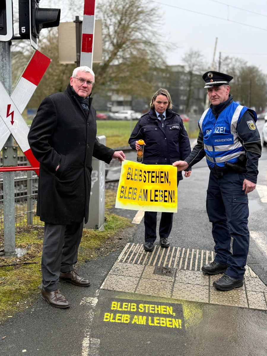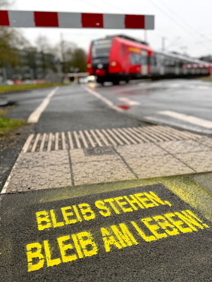 Ein zentrales Element der Kampagne sind Sprüh-Stempel mit der Aufschrift "BLEIB STEHEN, BLEIB AM LEBEN!", die künftig an Gehwegen im Bereich von Bahnübergängen im Zuständigkeitsbereich der Polizei Rhein-Sieg eingesetzt werden. Ergänzt wird die Aktion durch eine begleitende Social-Media-Kampagne, die insbesondere jüngere Verkehrsteilnehmende ansprechen soll.