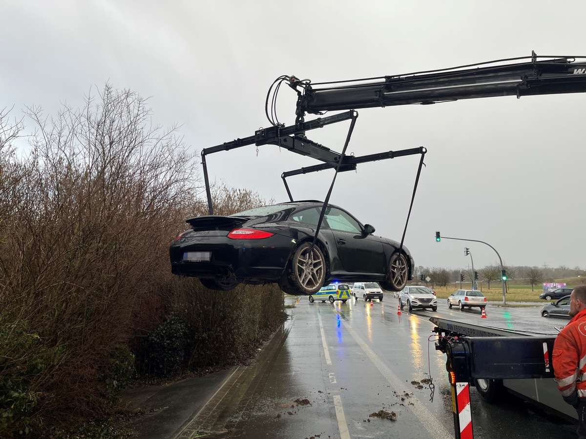 Der Fahrer fuhr über das Feld zurück auf die Kliever Straße und setzte seine Fahrt in Richtung B1 fort. Im Bereich der Kreuzung fuhr der Porsche an mehreren Fahrzeugen, die an der roten Ampel warteten, vorbei. Dabei kollidierte er mit einem hellen Transporter, bevor er auf die B1 in Fahrtrichtung Soest abbog. Als der Fahrer erneut stark beschleunigte, drehte der Porsche sich und blieb im Bereich einer Hauseinfahrt stehen.