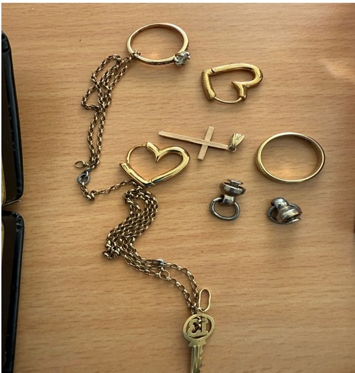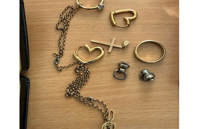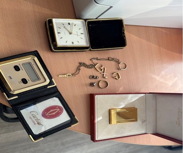 Bei den Gegenständen handelt es sich um verschiedene Schmuckstücke, zwei Taschenuhren und ein Feuerzeug des Herstellers Dupont.
