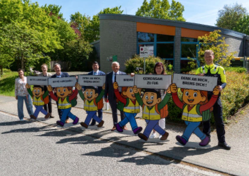 "Brems Dich!", "Pass auf!", "Denk an mich, brems Dich!" oder "Gemeinsam zu Fuß!" - mit diesen klaren Botschaften werden die neuen Verkehrshelden der Polizei Viersen künftig im gesamten Kreisgebiet auf mehr Sicherheit im Straßenverkehr aufmerksam machen. Seit Freitag sind die auffälligen Präventionsaufsteller offiziell im Einsatz. Entwickelt wurden die Verkehrshelden von den Verkehrssicherheitsberaterinnen und Verkehrssicherheitsberatern der Polizei Viersen. Dank der Unterstützung der Kreisverkehrswacht Viersen e. V. sowie der Verkehrswacht Viersen e. V. konnten insgesamt sechs neue Aufsteller realisiert werden. Sie sind einheitlich gestaltet und greifen mit unterschiedlichen Appellen die Themen Aufmerksamkeit, Rücksichtnahme und angepasste Geschwindigkeit auf. Ein besonderes Anliegen der Aktion ist zudem, Eltern dazu zu ermutigen, ihre Kinder häufiger zu Fuß zur Schule oder in den Kindergarten zu begleiten. Dadurch kann der Fahrzeugverkehr unmittelbar vor den Einrichtungen reduziert und die Verkehrssituation deutlich entschärft werden. Am Freitag wurden die Verkehrshelden im Beisein von Landrat Bennet Gielen offiziell an die Polizei übergeben. Anschließend wurden die Aufsteller gemeinsam mit dem Landrat, dem Bürgermeister der Stadt Viersen, Christoph Hopp, Vertretern der Verkehrswachten und der Polizei für ihren ersten Einsatz an der KiTa Hüsgesweg in Viersen aufgestellt. "Nun ist es wichtig, dass die Verkehrshelden auch sichtbar eingesetzt werden", betont Verkehrssicherheitsberater Tobias Stapper. Schulen, Kindergärten und weitere Einrichtungen, die Interesse an einem Einsatz der Verkehrshelden haben, können sich an ihre örtlichen Verkehrssicherheitsberaterinnen und Verkehrssicherheitsberater wenden oder per E-Mail Kontakt aufnehmen: V_VUP.Viersen@polizei.nrw.de /jk (281)