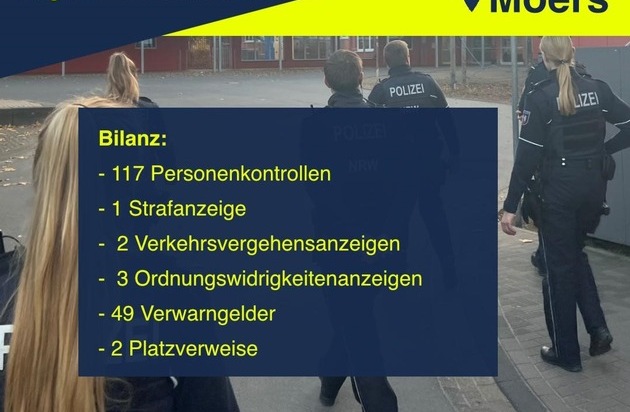 Am Donnerstag führte die Kreispolizeibehörde Wesel unter Einbindung von Polizeibeamtinnen - und Beamten einer Einsatzhundertschaft sowie der Ordnungsbehörde zahlreiche Kontrollen im Stadtgebiet Moers zur Bekämpfung der Bürgerbelastenden Kriminalität durch.