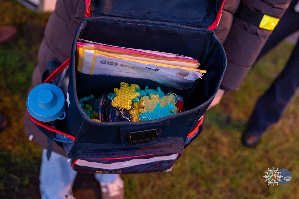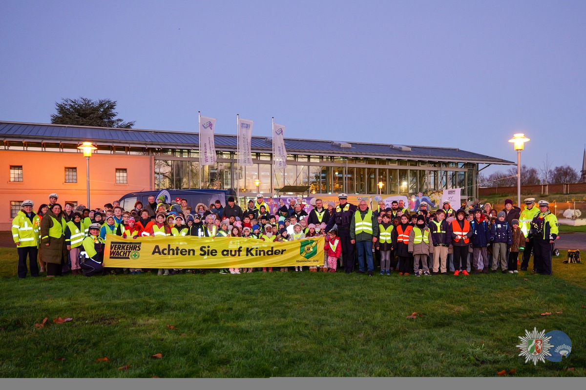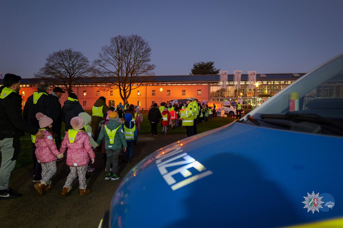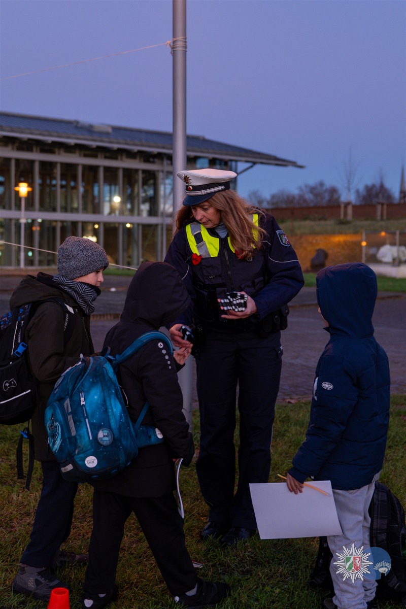 Deshalb zogen am Montag (15.12.2025) ab 07:30 Uhr ca. 180 Kinder mit bunten Lichtern und reflektierenden Westen durch die Straßen der Weseler Innenstadt in Richtung Zitadelle. Die kleinen Glühwürmchen wurden von den Verkehrssicherheitsberaterinnen und -beratern der Kreispolizei Wesel begleitet. Mit dieser Aktion sollten andere Verkehrsteilnehmende in der dunklen Jahreszeit für mehr Aufmerksamkeit und Rücksichtnahme sensibilisiert werden- insbesondere gegenüber Kindern! Gleichzeitig wurde den Kindern sowie ihren Erziehungsberechtigten so anschaulich vermittelt, wie mit einfachen Mitteln die Sichtbarkeit im Straßenverkehr verbessert und damit die Sicherheit der Kinder deutlich erhöht werden kann.