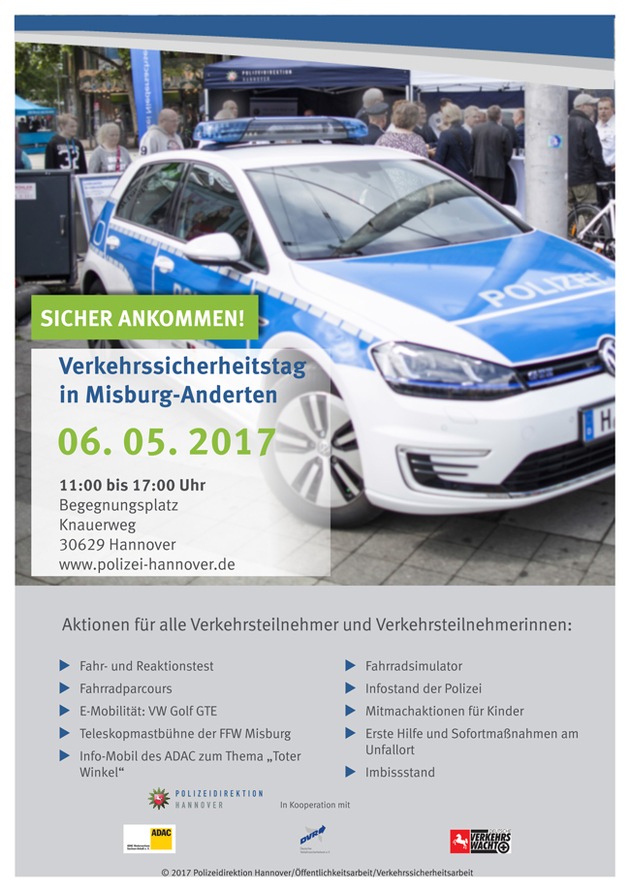 Am Samstag, 6. Mai 2017, findet auf dem Begegnungsplatz am Knauerweg (Misburg-Nord) der diesjährige Verkehrssicherheitstag der Polizei Misburg statt. Hierzu sind alle Interessierten in der Zeit von 11:00 Uhr bis 17:00 Uhr herzlich eingeladen.