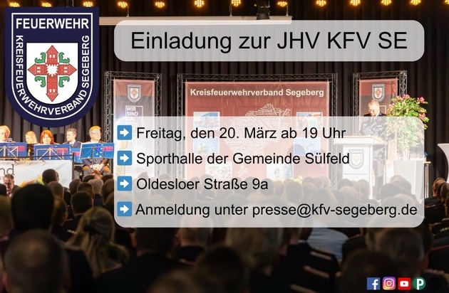 Sehr geehrte Vertreterinnen und Vertreter der Presse, der Kreisfeuerwehrverband Segeberg lädt Sie recht herzlich zur diesjährigen Jahreshauptversammlung für das Kalenderjahr 2025 ein.