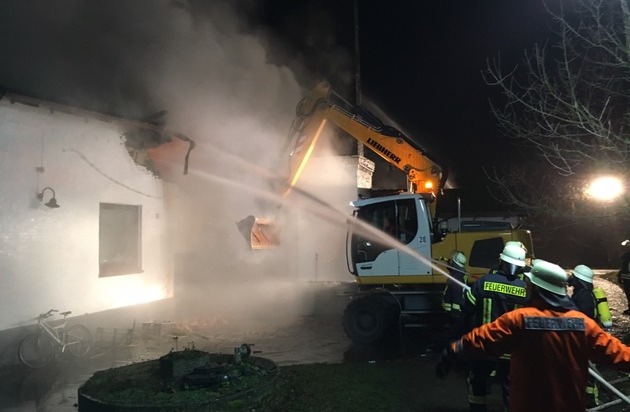 Als im späteren Einsatzverlauf das Feuer auf das Wohnhaus und den Dachstuhl übergriff war ein Innenangriff nicht mehr möglich. Mit einem Bagger wurde das Dach und ein Teil der Wände geöffnet, um mit der nachalarmierten Drehleiter aus Kappeln weitere Löscharbeiten durchführen zu können.