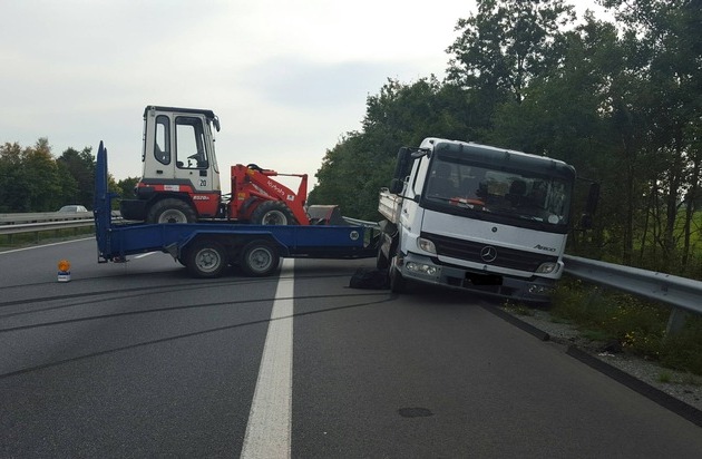 Am Montagnachmittag (05. Oktober 2015) gegen 15:30 Uhr verunfallte ein Lkw mit Anhänger auf der Autobahn (A 27) zwischen den Anschlussstellen Stotel und Hagen in Fahrtrichtung Bremen, was zu einer mehrstündigen Sperrung führte. Der 56-jährige Lkw-Fahrer aus Essen befuhr mit seinem Gepann die Autobahn, als sich sein Anhänger, beladen mit einem Radlader, aufschaukelte. Der Fahrzeugführer konnte das Gespann nicht mehr unter Kontrolle bringen, so dass dies schließlich nach rechts in die Seitenschutzplanke stieß. Das Zugfahrzeug kam entgegengesetzt der Fahrbahn zum Stehenm, und der Anhänger verkeilte sich auf dem Hauptfahrstreifen. Der 56-Jährige blieb unverletzt. Aufgrund der aufwendigen Bergung musste die Fahrbahn in Richtung Bremen zunächst für ca. 1 Stunde halbseitig und danach für ca. 3,5 Stunden voll gesperrt werden. Hierdurch kam es zu massiven Verkehrsbehinderungen auf der A 27 und auf den Umleitungsstrecken. Der entstandende Gesamtschaden beträgt ca. 20.000 Euro.
