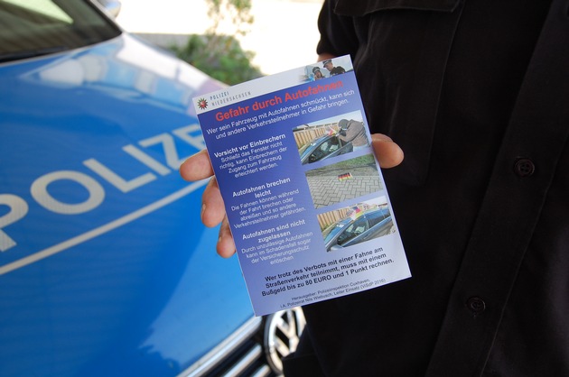 "Die Polizei will keine Spaßbremse sein, wir sehen uns aber in der Pflicht, aus Gründen der Verkehrssicherheit auf das richtige Verhalten im Straßenverkehr hinzuweisen", verdeutlicht Polizeioberkommissar Nils Kappmeier, der für die Polizeiinspektion Cuxhaven einen Flyer mit Verkehrssicherheitstipps zur EM entwickelt hat, der derzeit bei Verkehrskontrollen an Fahrzeugführer verteilt wird, um diese zu sensibilisieren (s. digitale Pressemappe).