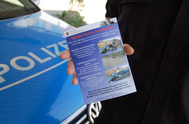 Durch das Anbringen von Fahnen oder Schals am Auto darf die Sicht des Fahrers nicht beeinträchtigt werden. Selbst kleinere Fahnen stellten für andere Autofahrer, Radfahrer und Fußgänger eine potenzielle Gefahr dar, wenn sie verloren gingen und dabei durch die Luft wirbeln. Gemeint sind die kleinen "Plastikfahnen" die in die Seitenscheiben des Pkw geklemmt werden. Regelmäßig findet man diese Fahnen am Straßenrand liegen, da sie abbrechen oder gar abfallen. Solch eine Fahne kann, wenn sie bei der Fahrt vom Pkw abfällt, zu einer Gefahr für andere Verkehrsteilnehmer - insbesondere für Zweiradfahrer - werden. Sollte es dann zu einem Verkehrsunfall kommen, kann es sogar sein, dass die Versicherung nicht zahlt. Weiterhin besteht die Gefahr, dass die Seitenscheibe nicht richtig schließt und somit einem möglichen Dieb der Zugang zum Pkw erleichtert wird.