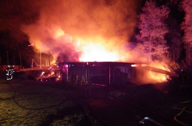 Geestland. In der Nacht zum heutigen Mittwoch (13.09.2017) wurde der Polizei gegen 3 Uhr früh ein Brand auf dem Gelände eines Wassersportvereins in der Straße "Am Kanal" in Bad Bederkesa gemeldet. Das auf dem Gelände befindliche Vereinsheim brannte aus bislang unbekannter Ursache nieder, es entstand ein Sachschaden in Höhe von mehreren zehntausend Euro. Die Feuerwehr war bis in die Morgenstunden mit den Löscharbeiten beschäftigt, die Ermittlungen zur Brandursache dauern an.