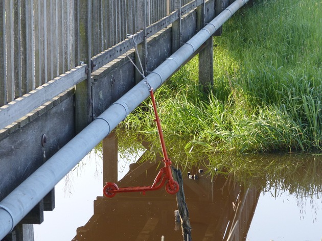In der Nacht zu Samstag befestigen bisher unbekannte Täter ein etwa 10m langes Nylon-Seil (grün/blau/gelb) über eine Holzbrücke des Gemeindeverbindungsweges zwischen Spaden und der Schiffdorfer Stauschleuse. Eine 41jährige Radfahrerin aus Spaden bemerkte das Hindernis zu spät, stürzte beim Abbremsen mit ihrem Fahrrad und zog sich leichte Beinverletzung zu. Bei der polizeiliche Sachverhaltsaufnahme konnte weiterhin ein am Brückengeländer befestigter Kinder/Tretroller, Farbe orange, sichergestellt werden.