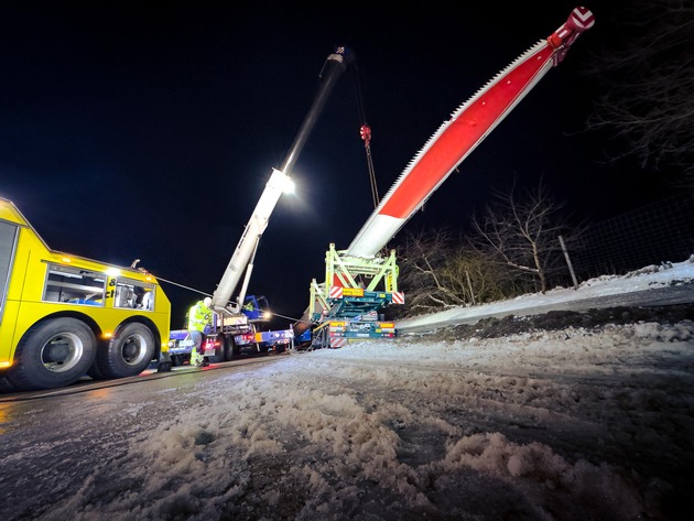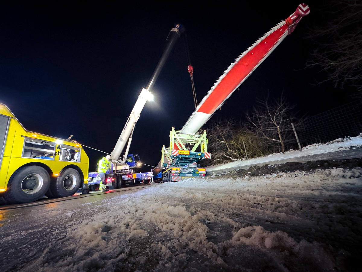 Geestland/BAB27. Am Dienstagabend (06.01.2026), gegen 22:00 Uhr, befuhr ein Schwerlasttransport die Autobahn 27 in Fahrtrichtung Süden. Kurz vor der Anschlussstelle Neuenwalde trat ein technischer Defekt an einem Anhänger auf, wodurch dieser plötzlich nach rechts lenkte. Hierdurch prallte das Fahrzeug gegen die Seitenschutzplanke und beschädigte diese über 200m. Der Anhänger verkeilte sich in der Seitenschutzplanke und musste mit schwerem Gerät geborgen werden. Hierfür musste die Autobahn zwischen den Anschlussstellen Nordholz und Neuenwalde voll gesperrt werden. Der Schwertransport war mit einem 72m langen Flügel einer Windkraftanlage beladen. Der 53-jährige Fahrzeugführer blieb unverletzt. Der entstandene Sachschaden wird auf 75.000 Euro geschätzt.