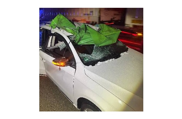 BAB 27/Loxstedt. Am gestrigen Freitag, 09.01.2026, befuhr ein 23-jähriger Bremerhavener, gegen 05:02 Uhr, die Baustelle zwischen den Anschlussstellen Bremerhaven-Wulsdorf und -Süd. Aufgrund starken Windes löste sich eine Plane samt Gestänge eines Sattelzuges, welcher die Baustelle in Richtung Cuxhaven befuhr. Die Plane traf den PKW VW des 23-Jährigen und drang durch die Karosserie, sodass dieser schwer verletzt und in ein umliegendes Krankenhaus verbracht wurde. Der PKW war nicht mehr fahrbereit. Der unbekannte Fahrzeugführer des Sattelzuges ist flüchtig. Bei der Plane handelt es sich um eine grüne LKW-Plane ohne Aufschrift. Der Gesamtschaden beträgt etwa 20.000 EUR. Zeugen, die Hinweise zu dem flüchtigen Sattelzug oder Fahrzeugführer geben können, werden gebeten, sich bei der Polizei Geestland unter der Telefonnummer 04743 928 0 zu melden. Bild vorhanden.