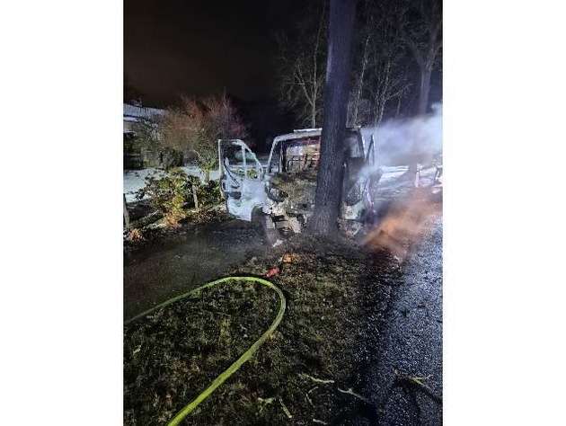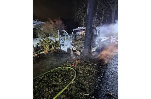 Cuxhaven - Am Samstagmorgen, ca. 01:10 Uhr, befuhr der 33jährige Fahrzeugführer eines Kleintransporters die Heerstraße in Richtung Cuxhaven. Vermutlich aufgrund seiner offenkundigen Alkoholisierung in Kombination mit winterlichen Straßenverhältnissen geriet er nach rechts von der Fahrbahn und prallte gegen einen Straßenbaum. Hierdurch wurde der Beifahrer des Transporters leicht verletzt. Beide Fahrzeuginsassen konnten den stark beschädigten Transporter noch eigenständig verlassen, bevor dieser im Motorraum Feuer fing. Durch das schnelle Einschreiten der Feuerwehr Altenbruch konnte das Fahrzeug noch vor einem Vollbrand gelöscht werden. Dennoch dürfte der Sachschaden bei insgesamt über 20000 Euro liegen. Gegen den Fahrzeugführer wurden diverse Strafverfahren eingeleitet, sowie eine Blutprobe entnommen. Der Führerschein wurde beschlagnahmt und die Weiterfahrt bis auf weiteres untersagt. (Lichtbild im Anhang)
