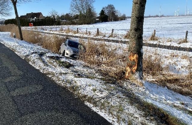Nordleda - Am Samstag gegen 11:30 Uhr befuhr der 72jährige Fahrzeugführer eines Ford C-Max die Otterndorfer Straße in Nordleda. Hier versuchte er trotz Winterglätte einen anderen PKW zu überholen, geriet jedoch ins Schleudern, prallte gegen einen Straßenbaum und endete schließlich im Graben. Der Fahrzeugführer wurde hierbei schwer verletzt und in der weiteren Folge durch den Rettungsdienst in ein Krankenhaus verbracht. Der entstandene Sachschaden dürfte mehrere Tausend Euro betragen. Während der Unfallaufnahme stellten die Polizeibeamten fest, dass an dem PKW lediglich Sommerreifen montiert waren und die fällige Hauptuntersuchung bereits mehr als 8 Monate überfällig war. Gegen den Fahrzeugführer wurden diverse Verkehrsordnungswidrigkeitenverfahren eingeleitet. (Lichtbild im Anhang)