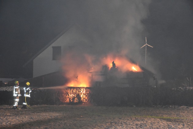 In der Hohewurthstraße in Lemwerder kam es am Sonnabend, 14.02.2026, gegen 19:00 Uhr zu einem Brand, in dessen Folge ein Carport mit integriertem Abstellraum vollständig zerstört wurde. Nachdem ein Bewohner den Brand per Notruf gemeldet hatte, stand der hölzerne Satteldach-Carport mit Abstellraum bei Eintreffen der alarmierten Feuerwehr- und Polizeikräfte bereits in Vollbrand. Die vier Bewohner im Alter zwischen 26 - 69 Jahren hatten bereits eigenständig und unverletzt das Haus verlassen. Durch den Löscheinsatz, bei dem die Freiwillige Feuerwehr Lemwerder mit 65 Kräften sowie die Drehleiter der Freiwilligen Feuerwehr Ganderkesee eingesetzt waren, konnte ein Übergreifen auf das Haus sowie einen angrenzenden Geräteschuppen verhindert werden. Der Brandursprung ist in dem Abstellraum des Carports anzunehmen, wobei die Brandursache z. Zt. ungeklärt und Gegenstand der weiteren polizeilichen Ermittlungen ist. Während der Carport samt Abstellraum vollständig zerstört wurde, weisen das Haus sowie der Geräteschuppen Schäden insbesondere durch die Strahlungshitze aber auch die Brandbekämpfung (Suche nach Glutnestern) auf. Das Haus ist weiterhin bewohnbar. Genaue Angaben zur Schadenshöhe sind nicht möglich. Als erste Schätzung wird ein mittlerer fünfstelliger Betrag angenommen.