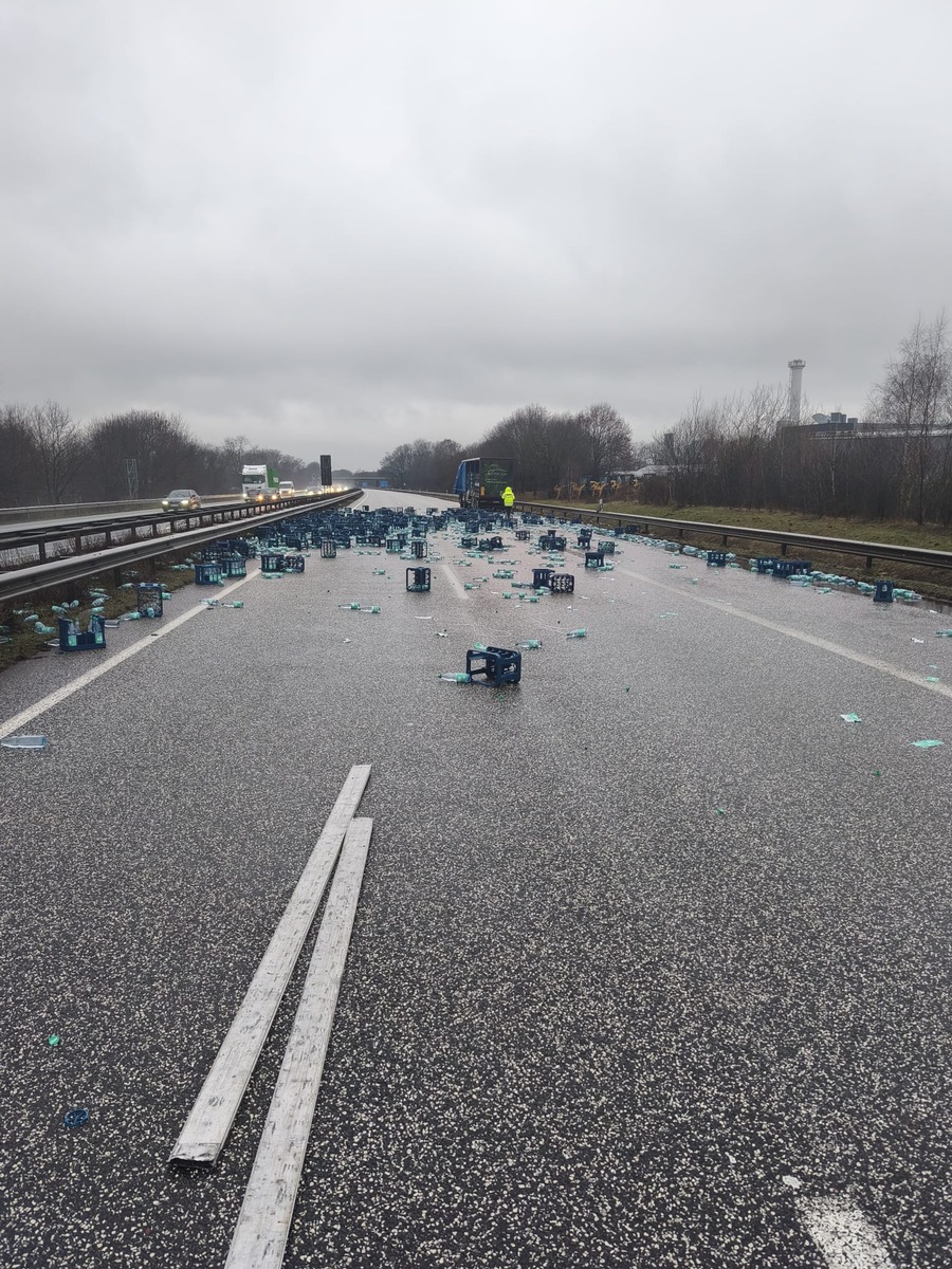 +Lkw verliert Wasserkisten+ Achim/A27. Auf der A27 in Fahrtrichtung Cuxhaven kam es am Freitagnachmittag, gegen 16.40 Uhr, kurz hinter der Anschlussstelle Achim-Ost zu einem Verkehrshindernis: Ein Sattelzug verlor einen Großteil seiner Ladung, bestehend aus knapp 200 Getränkekisten, die sich über die gesamte Richtungsfahrbahn verteilten. Nach ersten Erkenntnissen dürfte eine unzureichende Ladungssicherung ursächlich für den Ladungsverlust gewesen sein. Die Richtungsfahrbahn musste zunächst für etwa 30 Minuten voll gesperrt werden. Im Anschluss wurde der Verkehr über die Überfahrt an der Einsatzstelle vorbeigeleitet.