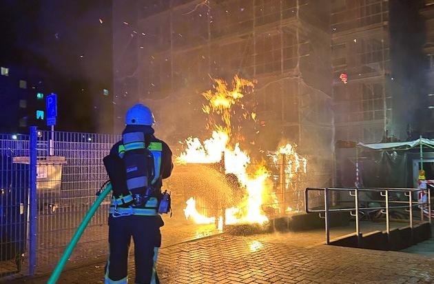 Kurz nach dem Jahreswechsel kam es dann zu zehn weiteren Einsätzen im Stadtgebiet. Dabei brannten erneut Müllcontainer und Mülltonnen sowie Reste von Feuerwerksbatterien. In den meisten Fällen reichte ein geringer Löschmitteleinsatz aus, um die Brände schnell zu löschen.