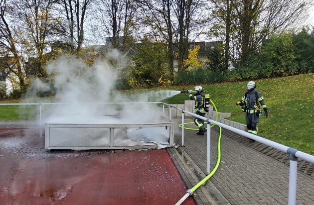 Gevelsberg, Donnerstag, 9:55 Uhr: Die Feuerwehr Gevelsberg wurde am Donnerstagvormittag zu einem eher ungewöhnlichen Einsatz auf den Sportplatz am Ochsenkamp alarmiert. Dort brannten ein Hochsprungkissen sowie eine dazugehörige Schutzbox in voller Ausdehnung. Beim Eintreffen der Einsatzkräfte stand das Sportgerät bereits lichterloh in Flammen. Ein Trupp unter schwerem Atemschutz nahm umgehend die Brandbekämpfung mit einem C-Rohr vor. Durch den schnellen und gezielten Einsatz konnte das Feuer rasch unter Kontrolle gebracht werden. Nach etwa einer Stunde war der Einsatz für die insgesamt zehn Feuerwehrleute beendet. Personen kamen nicht zu Schaden. Für die Feuerwehr Gevelsberg endete damit ein nicht alltäglicher Einsatz auf dem Sportgelände.