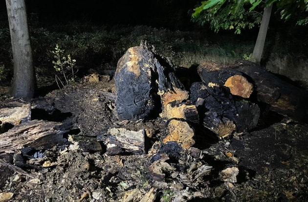 Das Löschgruppenfahrzeug der Löscheinheit Grundschöttel wurde dann direkt in den Genossenschaftsweg alarmiert. Hier sollte ein Baumstumpf brennen. Bei Eintreffen der ehrenamtlichen Einsatzkräfte brannten insgesamt zwei Baumstümpfe sowie eine Fläche von rund 25 Quadratmetern. Das Feuer wurde von einem Trupp abgelöscht. Um letzte Glutnester erreichen zu können, wurden die Baumstümpfe mit einer Motorsäge zerkleinert. Weitere Maßnahmen waren nicht erforderlich, sodass die Einsatzstelle nach rund zwei Stunden an die Polizei übergeben werden konnte.