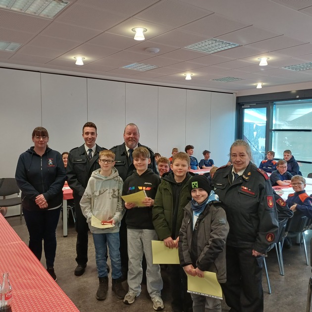 Im Rahmen der Besprechung konnten zudem vier Kinder gemeinsam mit ihren Eltern begrüßt werden, für die ein besonderer Anlass anstand: Sie wurden im Verlauf der Veranstaltung offiziell aus der Kinderfeuerwehr in die Jugendfeuerwehr übernommen. Mit diesen vier Neuübernahmen konnten im Jahr des zehnjährigen Bestehens der Kinderfeuerwehr bereits insgesamt 42 Kinder erfolgreich in die Jugendfeuerwehr übergeleitet werden - ein deutliches Zeichen für die kontinuierlich erfolgreiche Nachwuchsarbeit der Feuerwehr Wetter (Ruhr).