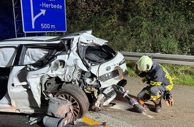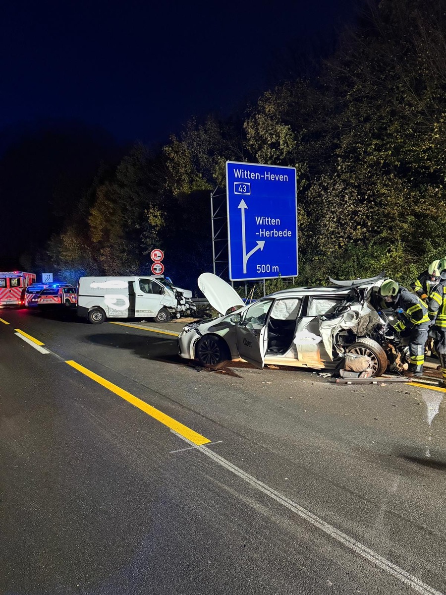 Samstagmorgen kam es auf der BAB 43 in Fahrtrichtung Münster kurz vor der Abfahrt Herbede zu einem Verkehrsunfall. Gegen 5.55 Uhr wurden die Einsatzkräfte der Feuerwehr Sprockhövel alarmiert. Bei Eintreffen der Feuerwehr an der Einsatzstelle wurden bereits zwei verletzte Personen vom Rettungsdienst versorgt. Die Feuerwehr sicherte die Unfallstelle gegen den nachfolgenden Verkehr und leuchtete diese aus. Ausgelaufene Betriebsmittel wurden mit Bindemitteln aufgenommen. An den Fahrzeugen wurden aus Sicherheitsgründen die Batterien abgeklemmt. Einsatzende war gegen 7.20 Uhr.