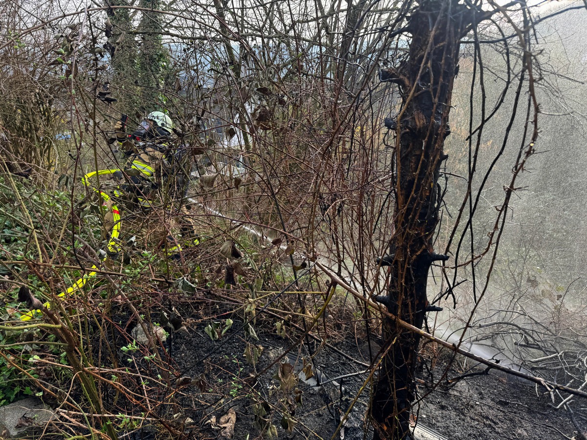 Um 16:51 Uhr wurde schließlich ein Flächenbrand aus der Straße Kleffweg am Herrentisch gemeldet. Eine starke Rauchentwicklung wieß den Einsatzkräften auf der Anfahrt den Weg. Beim Eintreffen der Feuerwehr brannte Vegetation in unwegsamem Gelände hinter zwei Gebäuden. Aufgrund der Lage bestand die Gefahr einer Brand- und Rauchausbreitung auf ein angrenzendes Gebäude, in dem zudem ein Fenster im Erdgeschoss offen stand. In der Wohnung mit dem geöffneten Fenster befand sich währenddessen eine Person, die sich erst später bemerkbar machte. Diese hatte das Klingeln und Klopfen der Feuerwehr zunächst nicht bemerkt, da sie Kopfhörer trug.