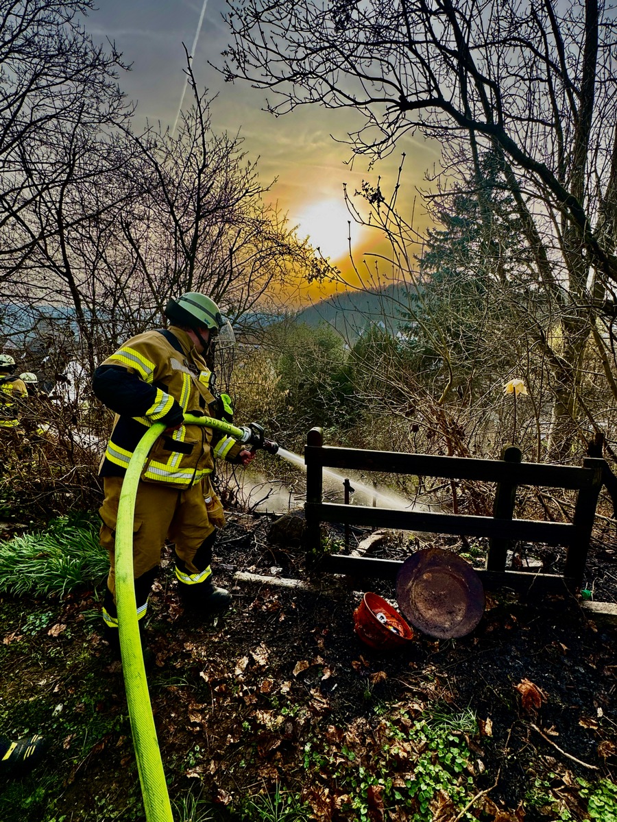 Die Einsatzkräfte gingen mit zwei C-Rohren unter Atemschutz zur Brandbekämpfung und zur Verhinderung einer Ausbreitung vor. Glücklicherweise entstand nur Sachschaden im Außenbereich des Grundstücks. Unter anderem wurde ein dort befindlicher Grillplatz durch das Feuer zerstört.