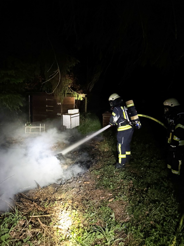 Datum: 13.04.2026/ Uhrzeit: 20:52 Uhr/ Dauer: ca. 90 Minuten/ Einsatzstelle: Steinbachstraße/ Einheiten: Löschzug Breckerfeld, Löschgruppe Delle/ Polizei/ Bericht (hb): Am Montagabend wurde die Feuerwehr Breckerfeld zu einem Flächenbrand in die Steinbachstraße alarmiert. Dort brannte es auf etwa 25 Quadratmetern auf einer kleinen Freifläche im Wald in direkter Nähe zu einigen Gartenhütten, die bereits wärmebeaufschlagt waren. Die Einsatzkräfte der Feuerwehr Breckerfeld löschten das Feuer unter Atemschutz und konnten so eine Ausbreitung auf die Hütten und den Wald verhindern. Hinweis für Redaktionen: Das beigefügte Bildmaterial darf unter der Quellenangabe "Foto: Feuerwehr Breckerfeld" honorarfrei für die Berichterstattung verwendet werden. Eine darüberhinausgehende Nutzung bedarf der schriftlichen Zustimmung.