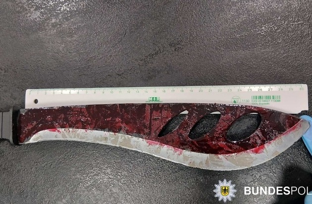 Nach der Einfahrt des Zuges in den Kölner Hauptbahnhof stellten Einsatzkräfte der Bundespolizei den 30-jährigen polnischen Staatsangehörigen noch im Zug fest. Zugbegleiter hatten den Mann zuvor schlafend in einem Abteil angetroffen. Die Machete befand sich dort in seinem unmittelbaren Zugriffsbereich und wurde durch das Zugpersonal umsichtig entfernt. Zudem wurden weitere Reisende vorsorglich aus dem Abteil gebracht.