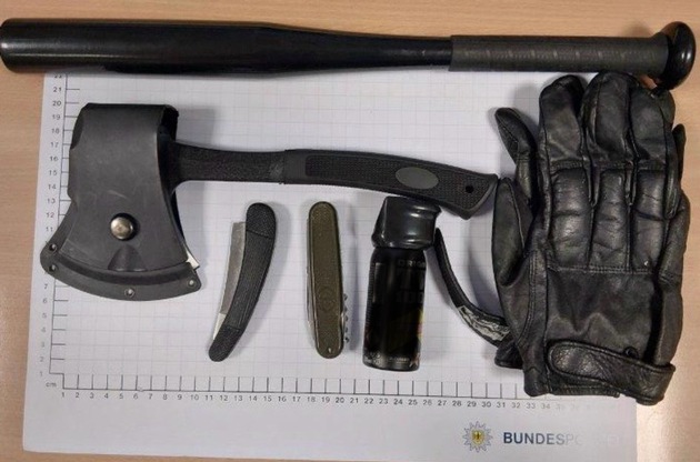Die Beamten stellten den Deutschen und belehrten ihn. Er machte von seinem Aussageverweigerungsrecht Gebrauch. Bei einer anschließenden Durchsuchung fanden die Uniformierten neben dem Pfefferspray eine Axt, einen Baseballschläger, Quarzhandschuhe und zwei Messer und beschlagnahmten die Gegenstände.