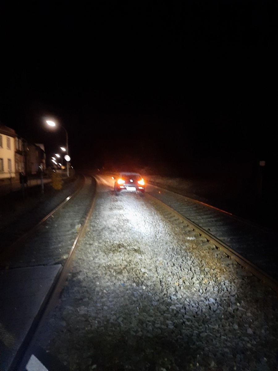 Am 18. November 2025 um 00:20 Uhr erreichte die Bundespolizei die Information, dass sich ein Fahrzeug im Gleisbereich am Bahnübergang Kirn festgefahren hat. Die 66-jährige deutsche Fahrerin des PKW gab der Polizei gegenüber an, sie habe den Straßenverlauf nicht erkannt und sei daher aus Versehen zwischen die beiden Schienenstränge in den Gleisbereich gefahren. Die Frau stimmte einem freiwilligen Atemalkoholtest zu. Dieser ergab 0,0 Promille. An den Bahnanlagen wurden keine Schäden festgestellt. Das Fahrzeug sprang nicht mehr an, mutmaßlich war die Batterie leer, weshalb die Polizisten das Fahrzeug aus dem Gleisbereich in eine Parklücke schoben. Insgesamt war die Strecke von 00:24 Uhr bis 01:17 Uhr gesperrt. Es kam zu keinen Auswirkungen auf den Bahnverkehr.
