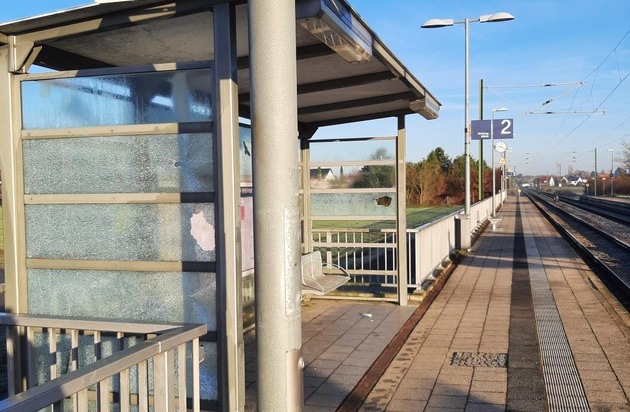 Am Montagmorgen, den 1. Dezember 2025 zwischen 1:00 Uhr und 8:00 Uhr, kam es am Haltepunkt in der Alten Römerstraße in Rheinzabern zu mehreren mutwilligen Sachbeschädigungen. Im genannten Zeitraum wurden sieben Scheiben des Wetterschutzhauses auf Bahnsteig 1 sowie elf Scheiben des Wetterschutzhauses auf Bahnsteig 2 zerstört. Weiterhin wurde der Bildschirm des sich dort befindlichen Fahrkartenautomaten beschädigt. Der Sachschaden wird auf 5000 Euro geschätzt. Zeugen, die den Vorfall beobachtet haben oder sachdienliche Hinweise zu den Tätern geben können, werden gebeten sich bei der Bundespolizeiinspektion Kaiserslautern zu melden. Hinweise können per E-Mail an bpoli.kaiserslautern@polizei.bund.de oder telefonisch unter 0631/34073-0 sowie bei jeder anderen Polizeidienststelle abgegeben werden.