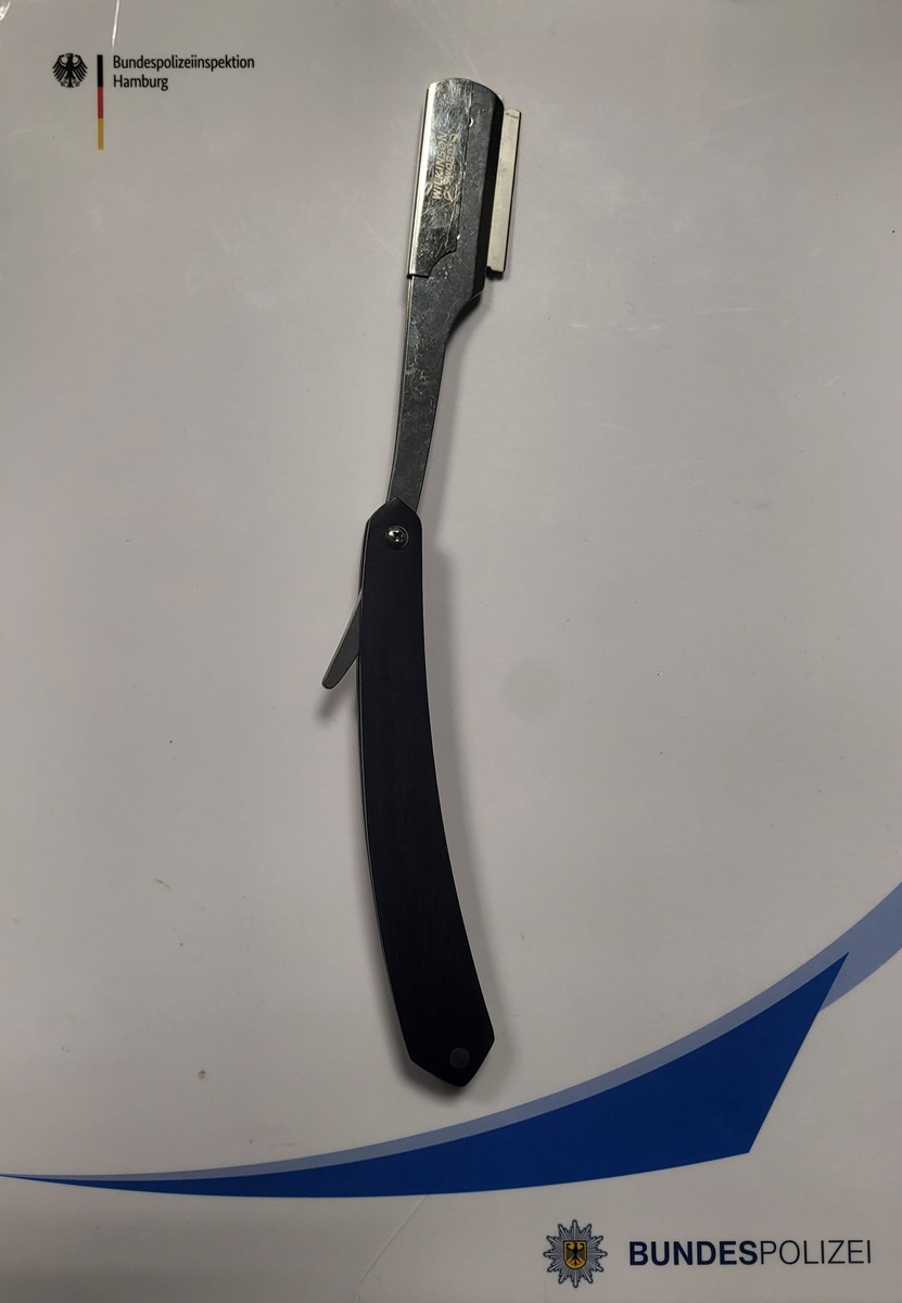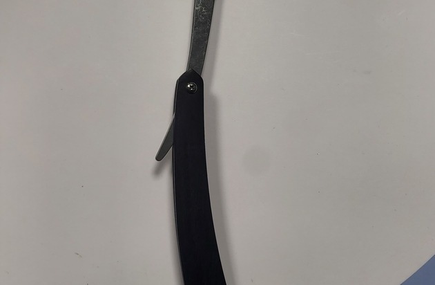 "Bei der Durchsuchung der Bekleidung wurde das mutmaßliche Tatmittel, ein Rasiermesser, in einer Hosentasche des Beschuldigten aufgefunden und sichergestellt." (siehe Foto vom Rasiermesser in der digitalen Pressemappe)