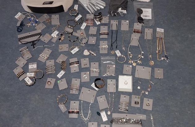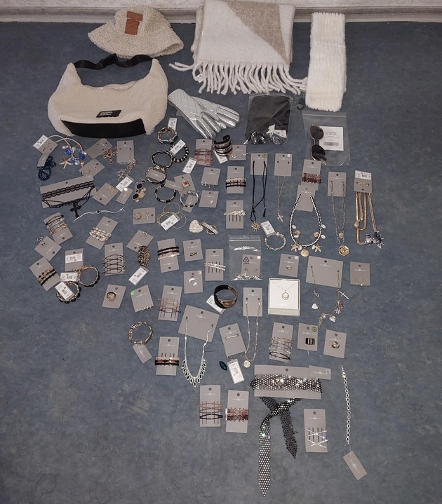 Die Tatverdächtige soll gegen 15:25 Uhr insbesondere diverse Schmuckartikel (75 Gegenstände im Wert von mindestens 949,05 EUR) aus den Regalen eines Modeschmuckladens entnommen und diese anschließend in einer ebenfalls entwendeten Handtasche verstaut haben.