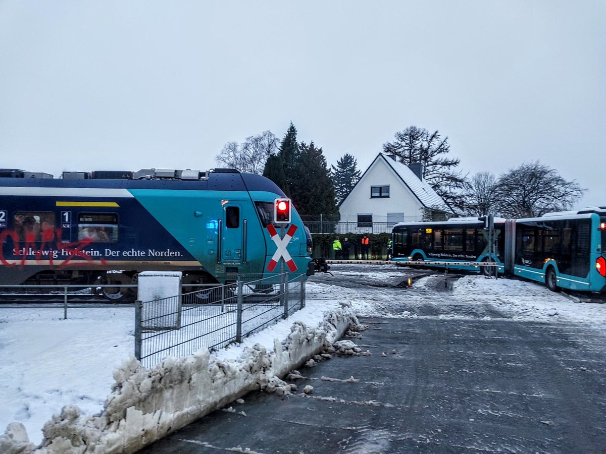 Ein Schulbus hatte sich heute Morgen auf einem Bahnübergang in der Ortschaft Ottendorf nahe Pönitz im Kreis Ostholstein aufgrund der Witterungsverhältnisse festgefahren. Schulkinder warnten einen herannahenden Regionalexpress mit Handylichtern. Der Treibfahrzeugführer konnte so noch rechtszeitig eine Schnellbremsung einleiten und kam knapp vor dem Schulbus zum Stehen.